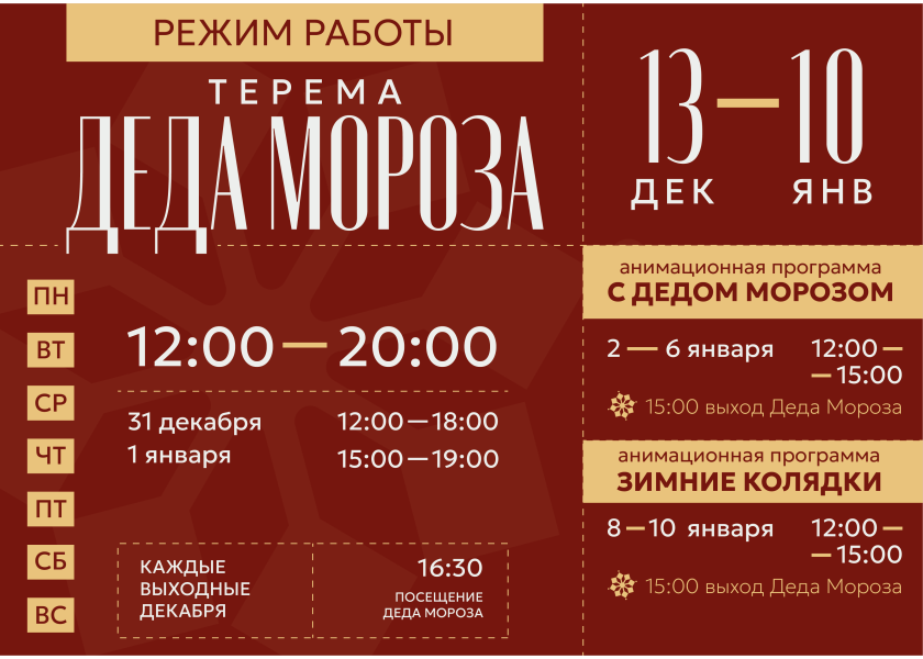 Каждые выходные декабря в 16:30 Дедушка Мороз лично приезжает в свой Терем: общается с ребятами, забирает письма, фотографируется с гостями, поддерживает праздничное настроение. После Нового года встречи продолжатся в рамках анимационных мероприятий.